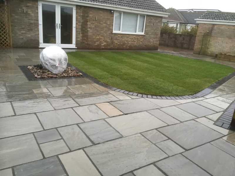 Indian natural sandstone patio installed in Grimsby by our landscape gardeners, random sizes and grouted with pave-fix. Paving supplied by www.naturalpaving.co.uk.
